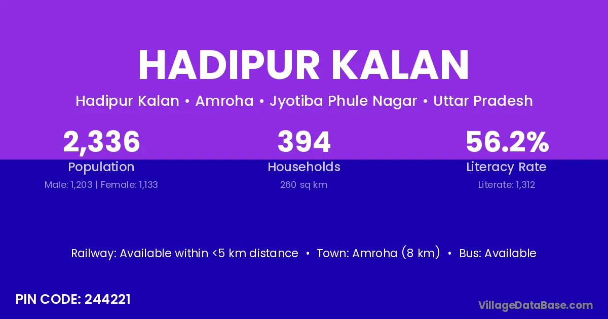 Amroha (8 km) is the nearest town to Hadipur Kalan village for major economic activities and is located approximately 8 km away.