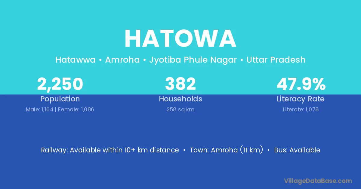 Amroha (11 km) is the nearest town to Hatowa village for major economic activities and is located approximately 11 km away.