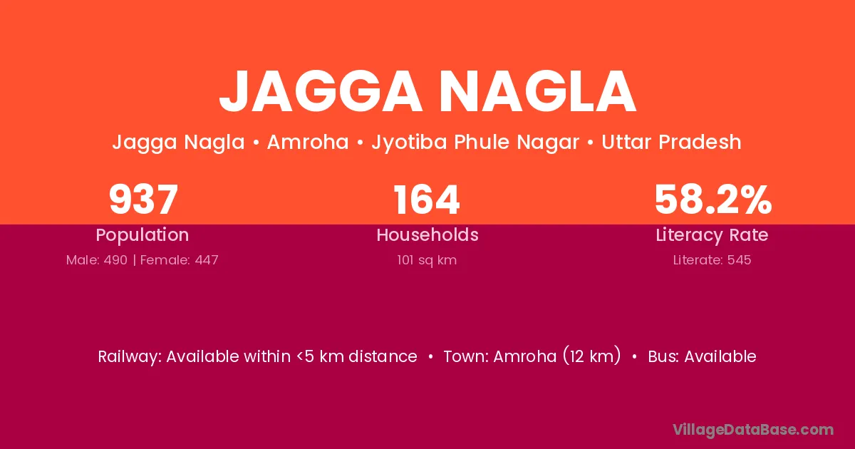 Amroha (12 km) is the nearest town to Jagga Nagla village for major economic activities and is located approximately 12 km away.
