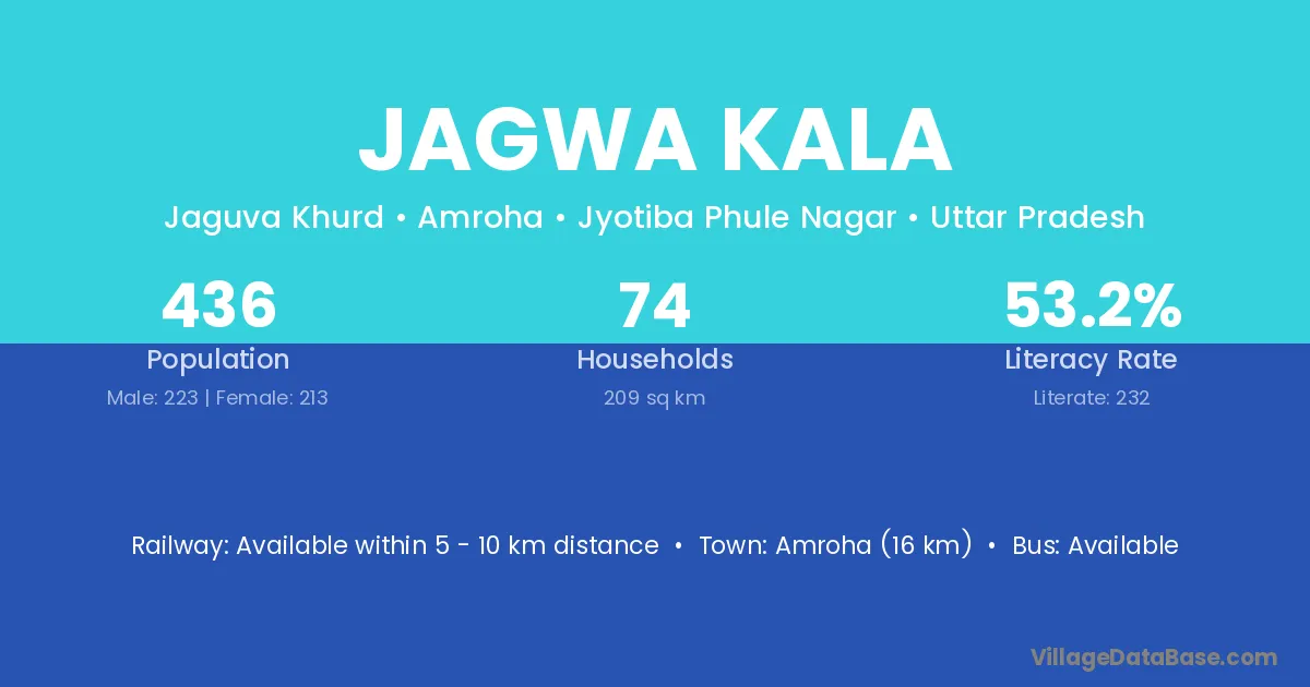 Amroha (16 km) is the nearest town to Jagwa Kala village for major economic activities and is located approximately 16 km away.