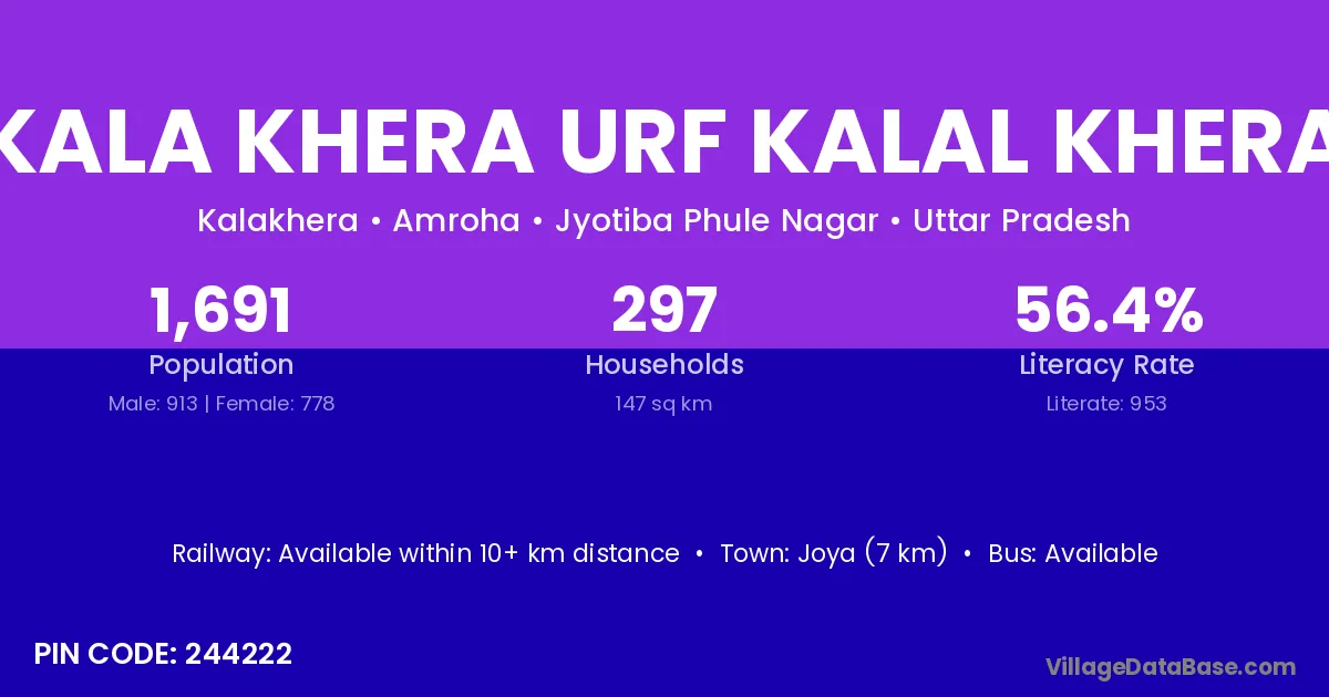 Joya (7 km) is the nearest town to Kala Khera Urf Kalal Khera village for major economic activities and is located approximately 7 km away.