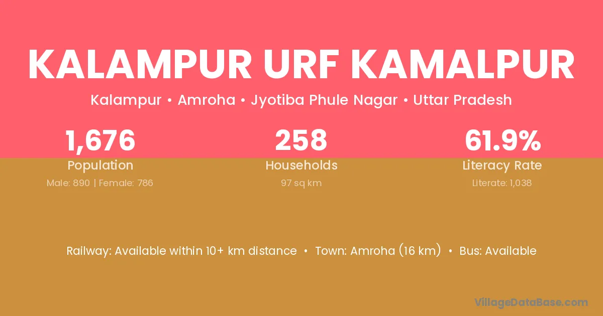 Amroha (16 km) is the nearest town to Kalampur Urf Kamalpur village for major economic activities and is located approximately 16 km away.