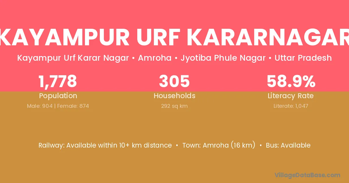 Amroha (16 km) is the nearest town to Kayampur Urf Kararnagar village for major economic activities and is located approximately 16 km away.