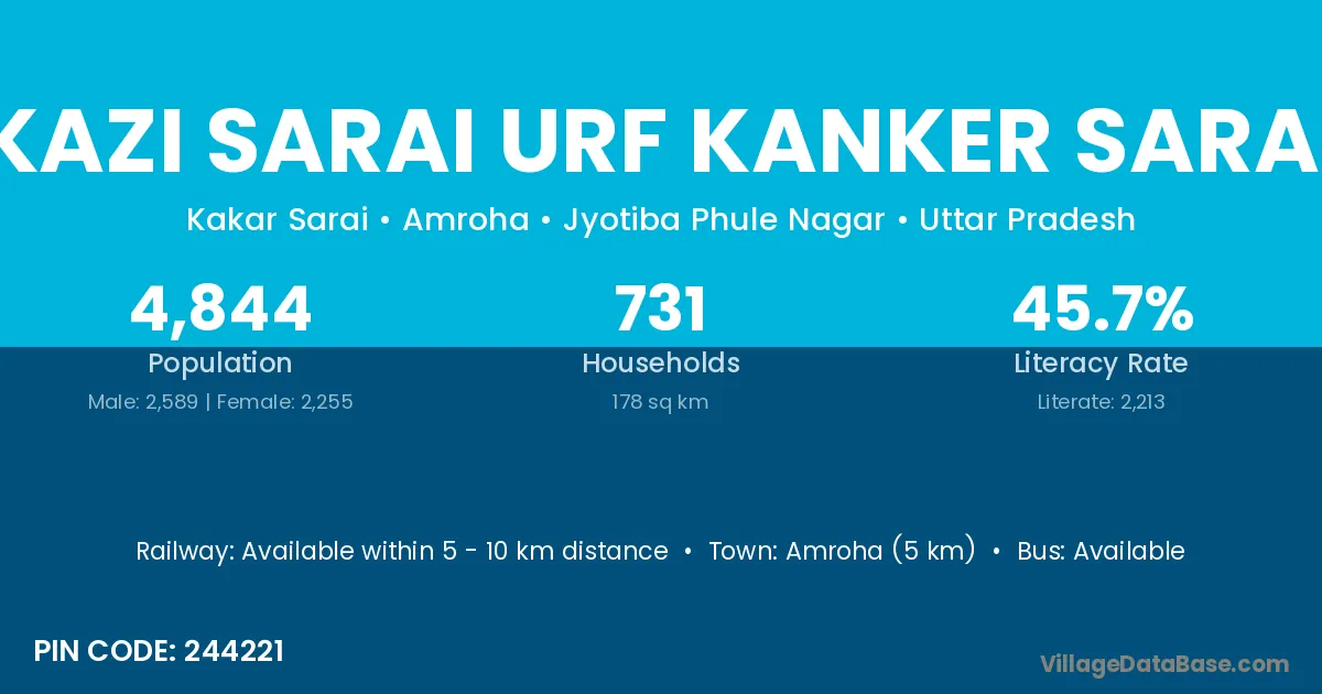 Amroha (5 km) is the nearest town to Kazi Sarai Urf Kanker Sarai village for major economic activities and is located approximately 5 km away.