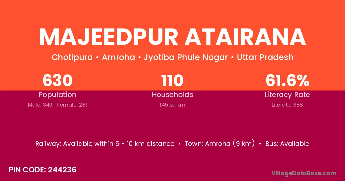 Amroha (9 km) is the nearest town to Majeedpur Atairana village for major economic activities and is located approximately 9 km away.