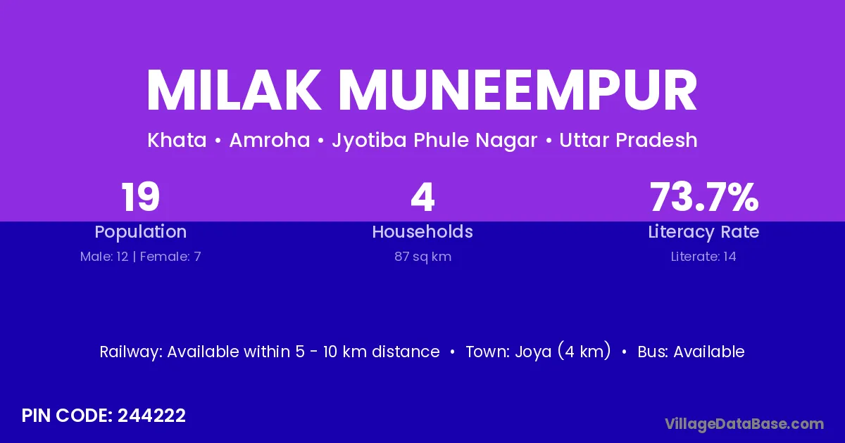 Joya (4 km) is the nearest town to Milak Muneempur village for major economic activities and is located approximately 4 km away.