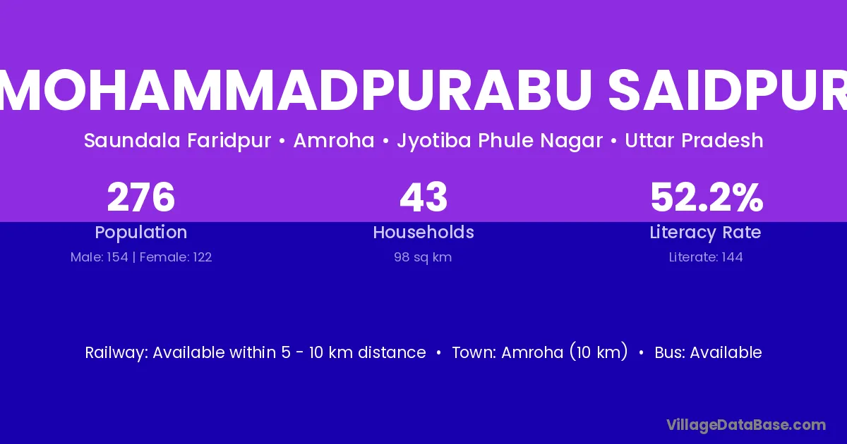Mohammadpurabu Saidpur village has a total population of 276 people, of which 154 are males and 122 are females.