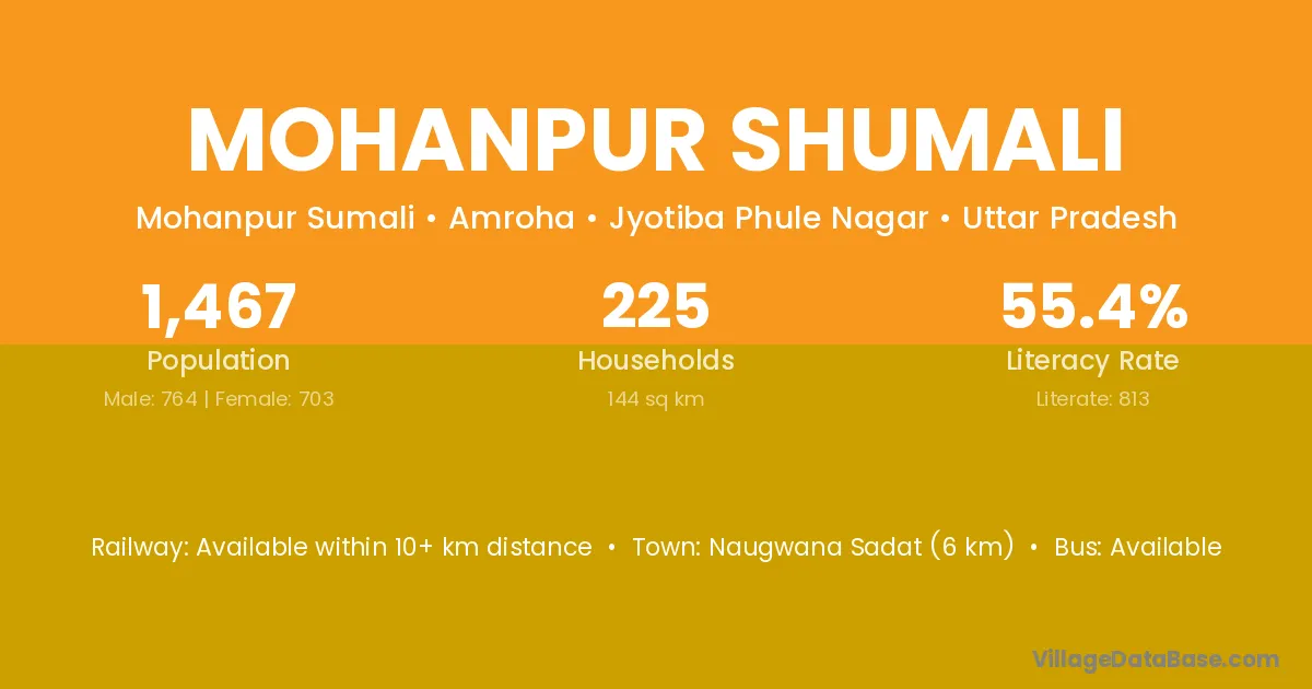 Mohanpur Shumali village has a total population of 1,467 people, of which 764 are males and 703 are females.
