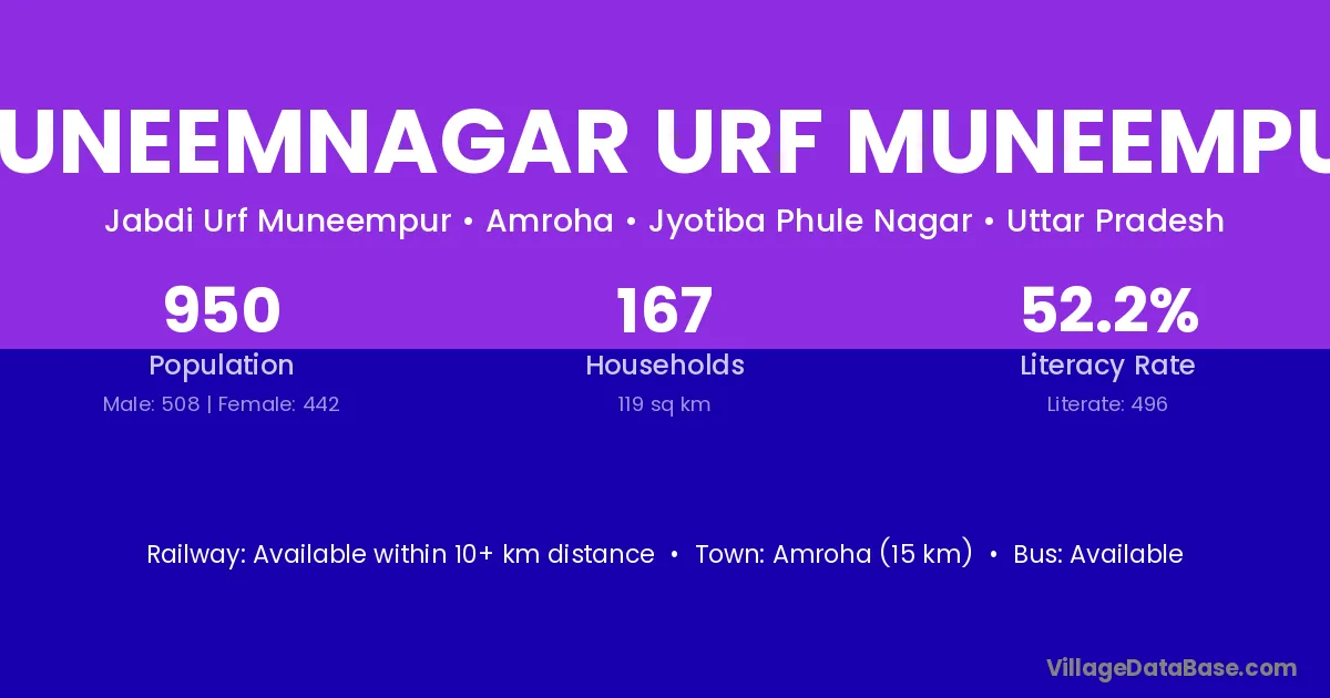 Muneemnagar Urf Muneempur village has a total population of 950 people, of which 508 are males and 442 are females.