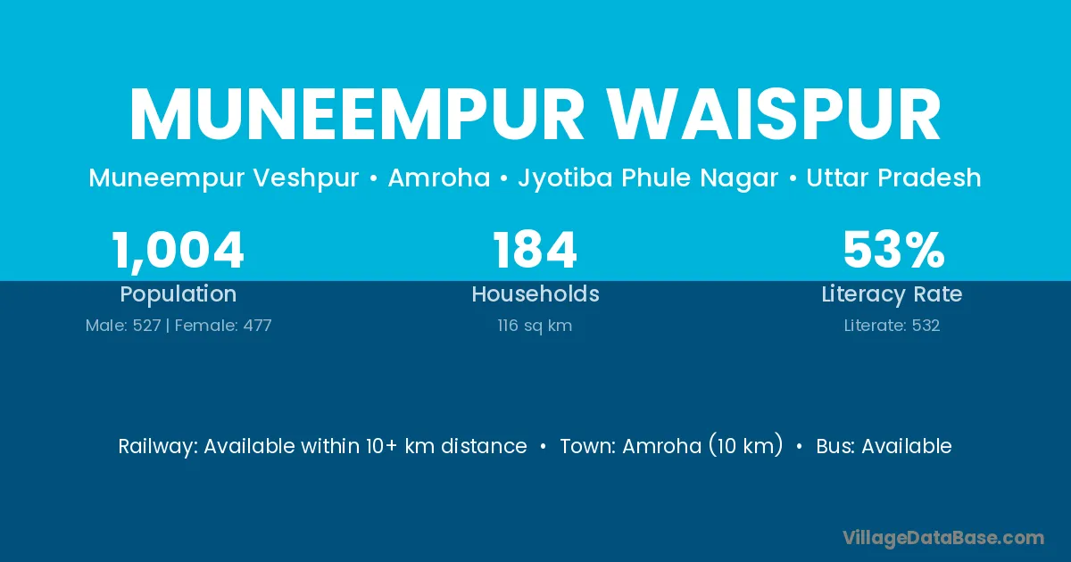 Amroha (10 km) is the nearest town to Muneempur Waispur village for major economic activities and is located approximately 10 km away.