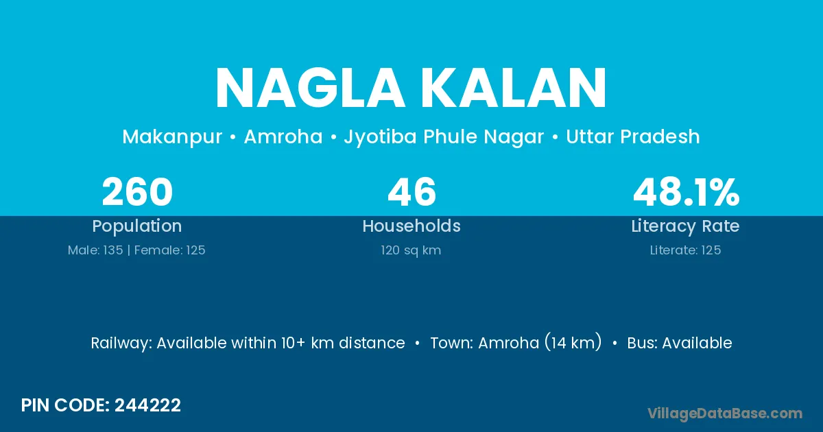 Amroha (14 km) is the nearest town to Nagla Kalan village for major economic activities and is located approximately 14 km away.