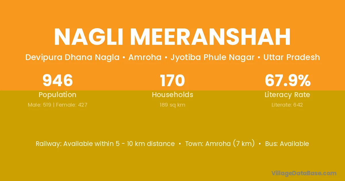 Amroha (7 km) is the nearest town to Nagli Meeranshah village for major economic activities and is located approximately 7 km away.