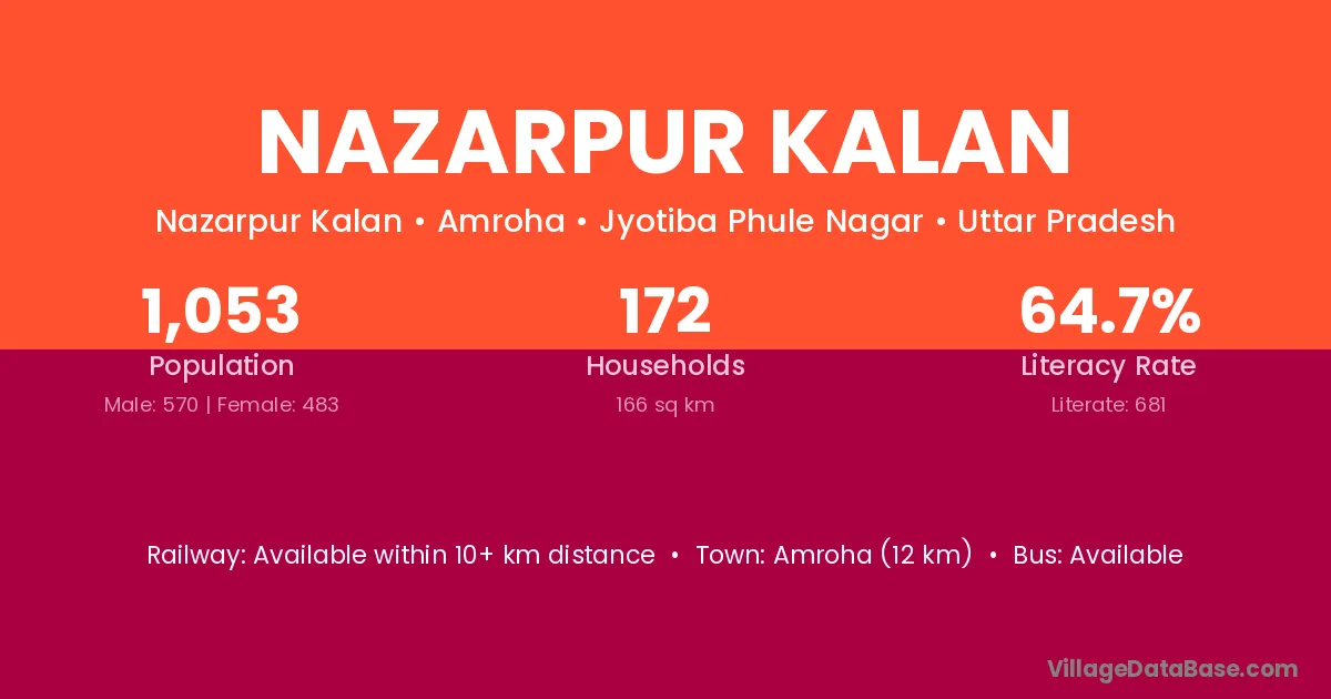 Amroha (12 km) is the nearest town to Nazarpur Kalan village for major economic activities and is located approximately 12 km away.