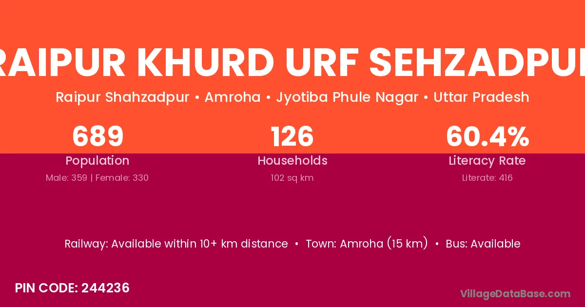 Amroha (15 km) is the nearest town to Raipur Khurd Urf Sehzadpur village for major economic activities and is located approximately 15 km away.