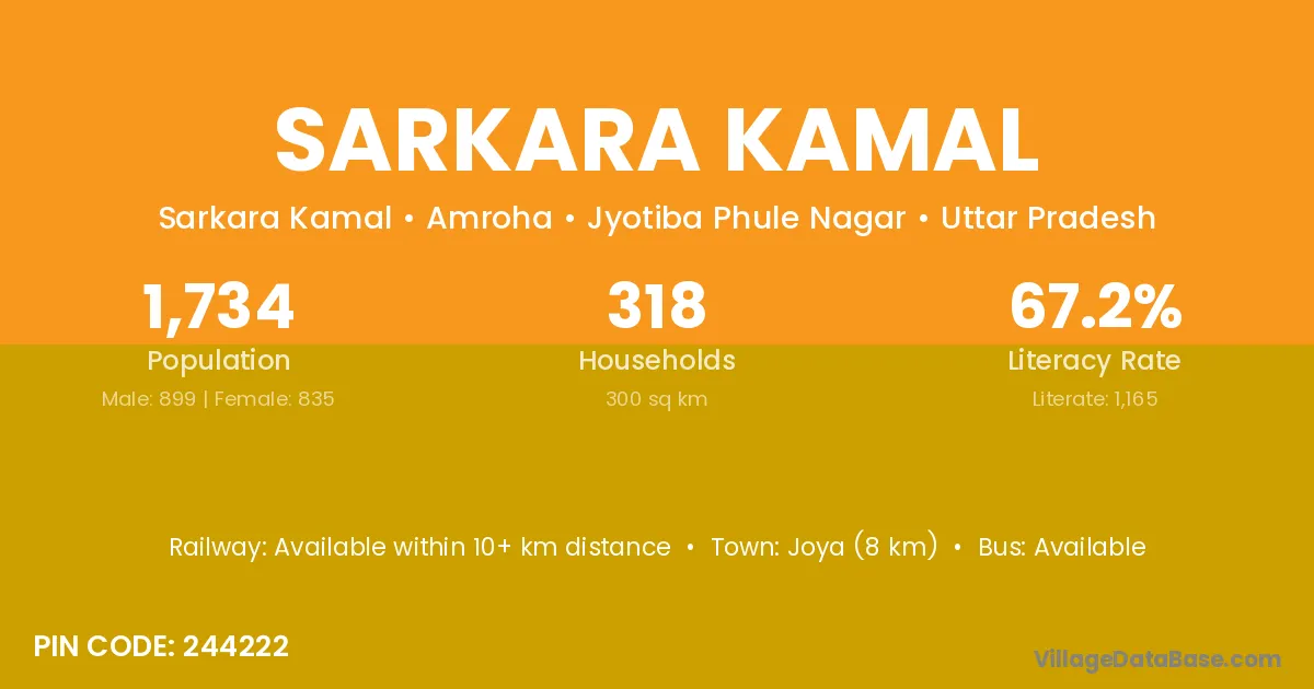 Joya (8 km) is the nearest town to Sarkara Kamal village for major economic activities and is located approximately 8 km away.