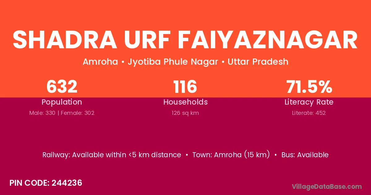 Amroha (15 km) is the nearest town to Shadra Urf Faiyaznagar village for major economic activities and is located approximately 15 km away.