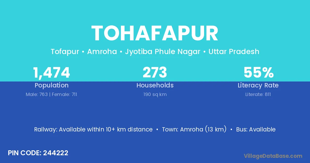 Amroha (13 km) is the nearest town to Tohafapur village for major economic activities and is located approximately 13 km away.