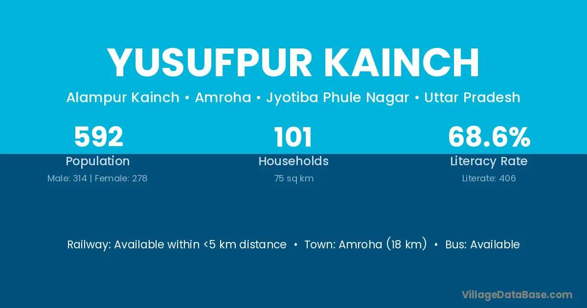 Amroha (18 km) is the nearest town to Yusufpur Kainch village for major economic activities and is located approximately 18 km away.