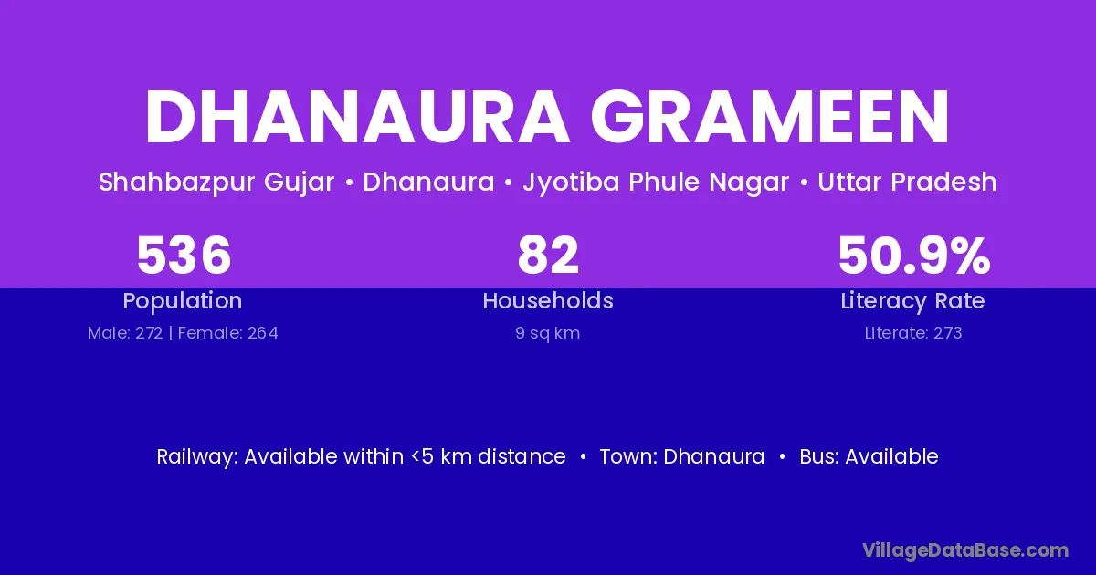 Dhanaura Grameen village has a total population of 536 people, of which 272 are males and 264 are females.