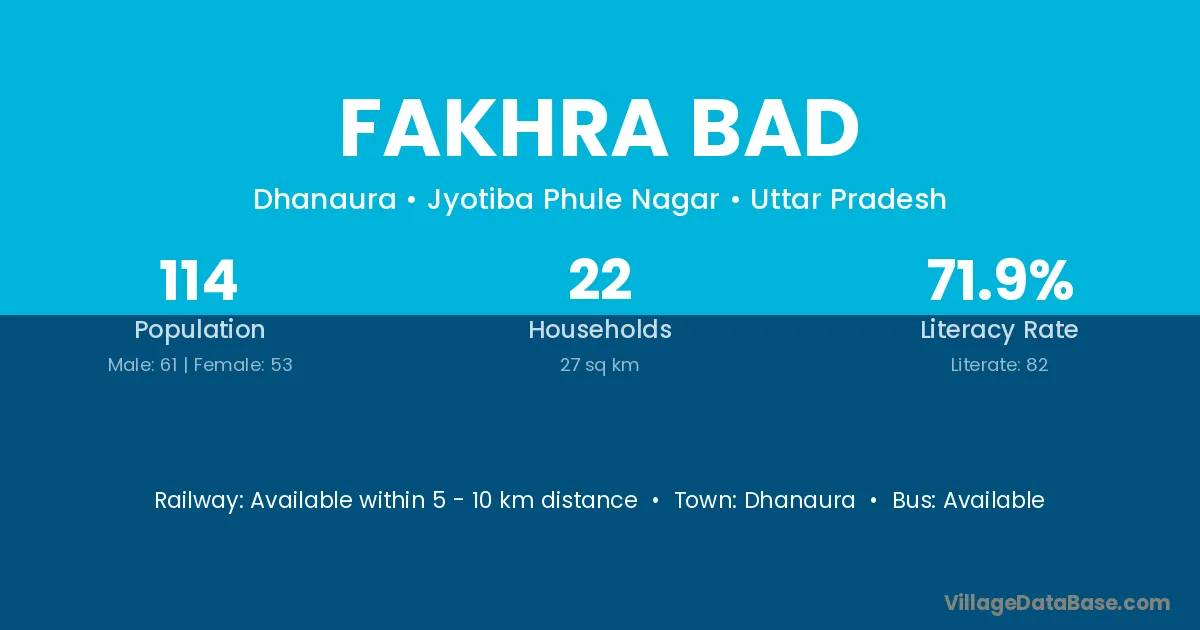 Fakhra Bad village has a total population of 114 people, of which 61 are males and 53 are females.