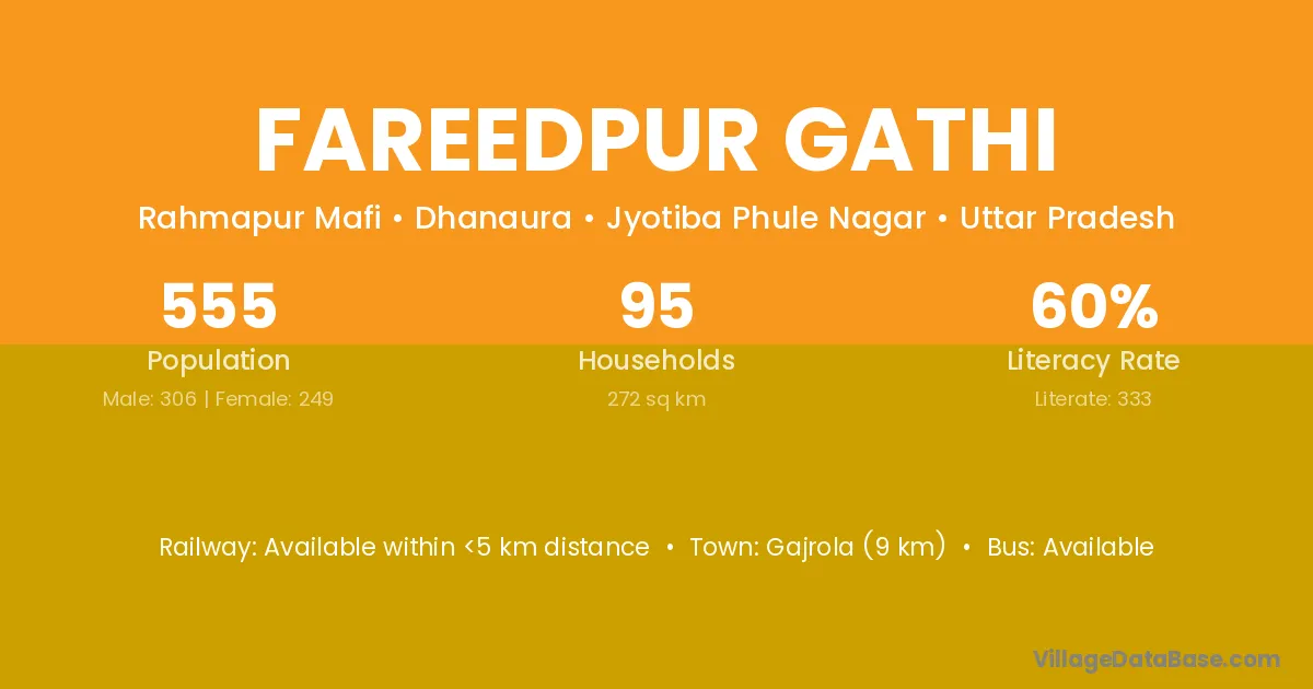 Gajrola (9 km) is the nearest town to Fareedpur Gathi village for major economic activities and is located approximately 9 km away.