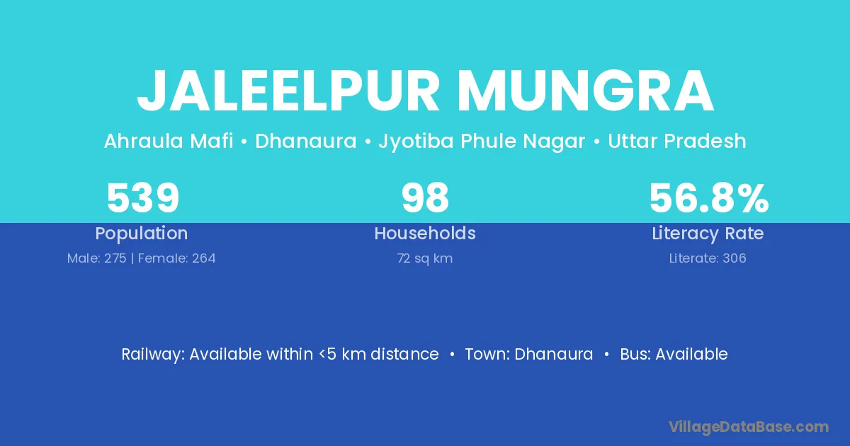 Jaleelpur Mungra village has a total population of 539 people, of which 275 are males and 264 are females.