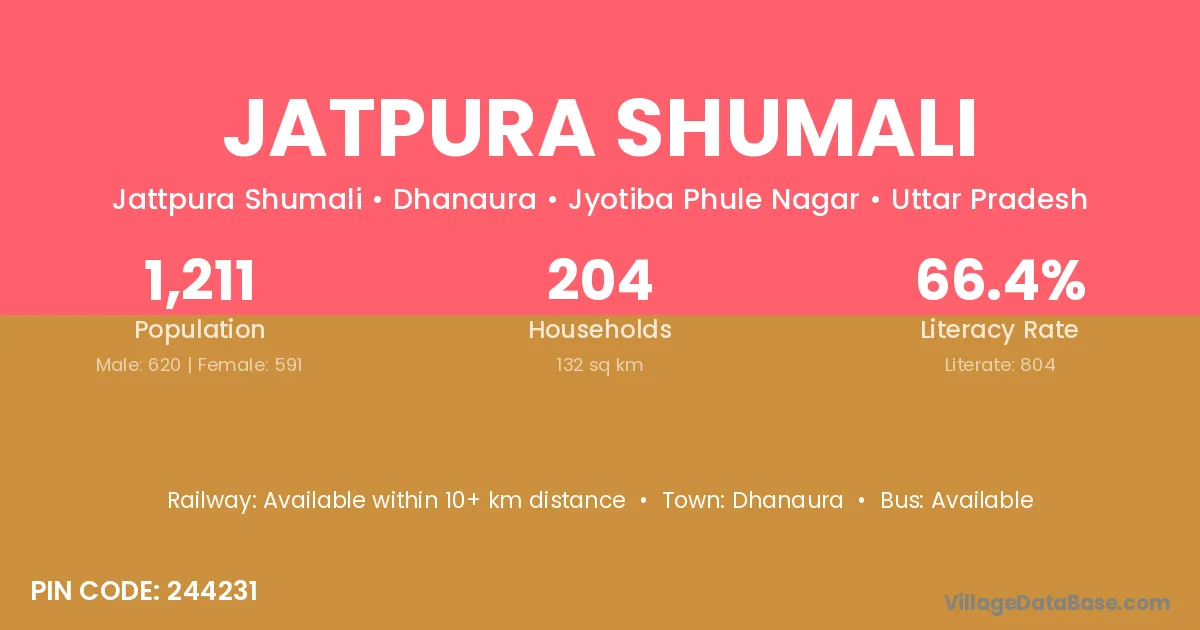 Jatpura Shumali village has a total population of 1,211 people, of which 620 are males and 591 are females.