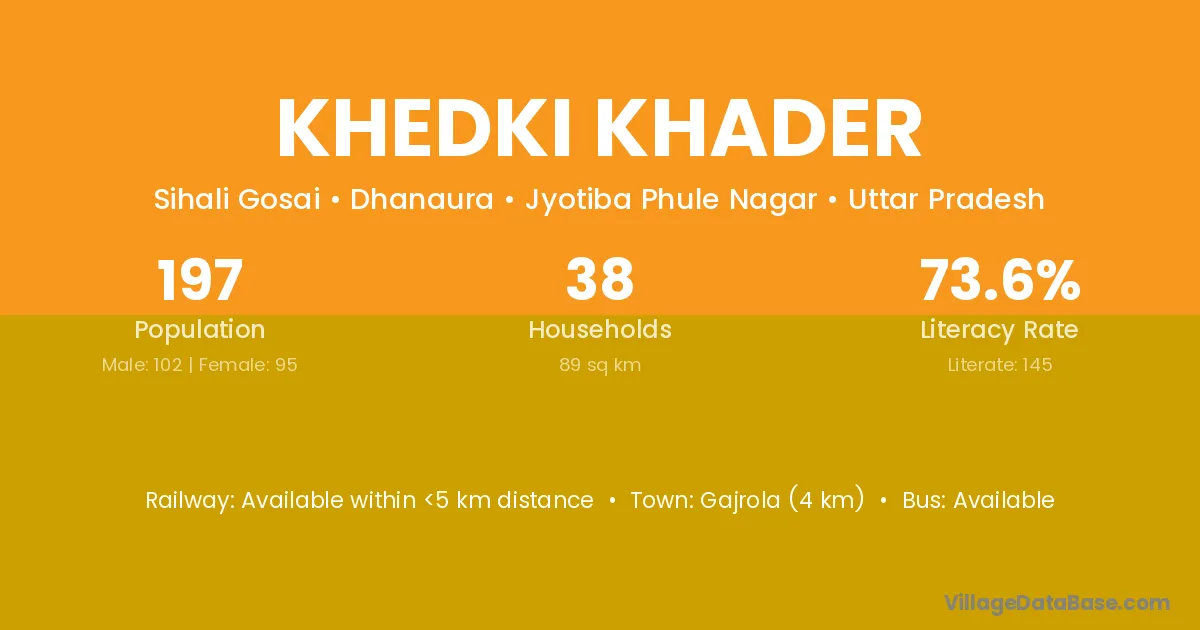 Gajrola (4 km) is the nearest town to Khedki Khader village for major economic activities and is located approximately 4 km away.