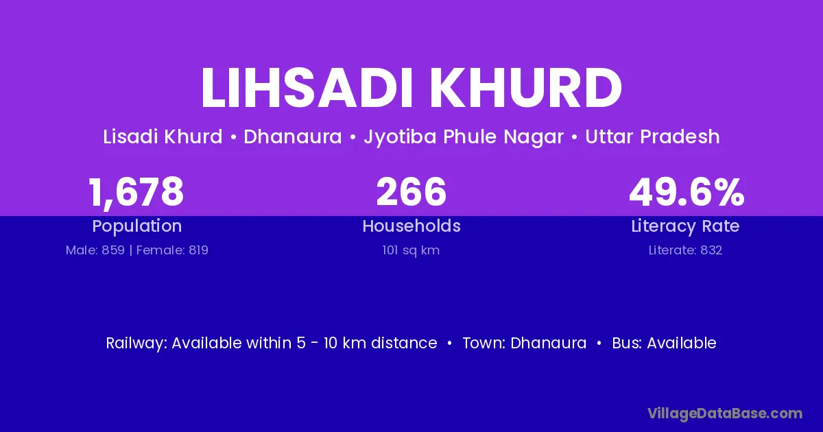 Lihsadi Khurd village has a total population of 1,678 people, of which 859 are males and 819 are females.