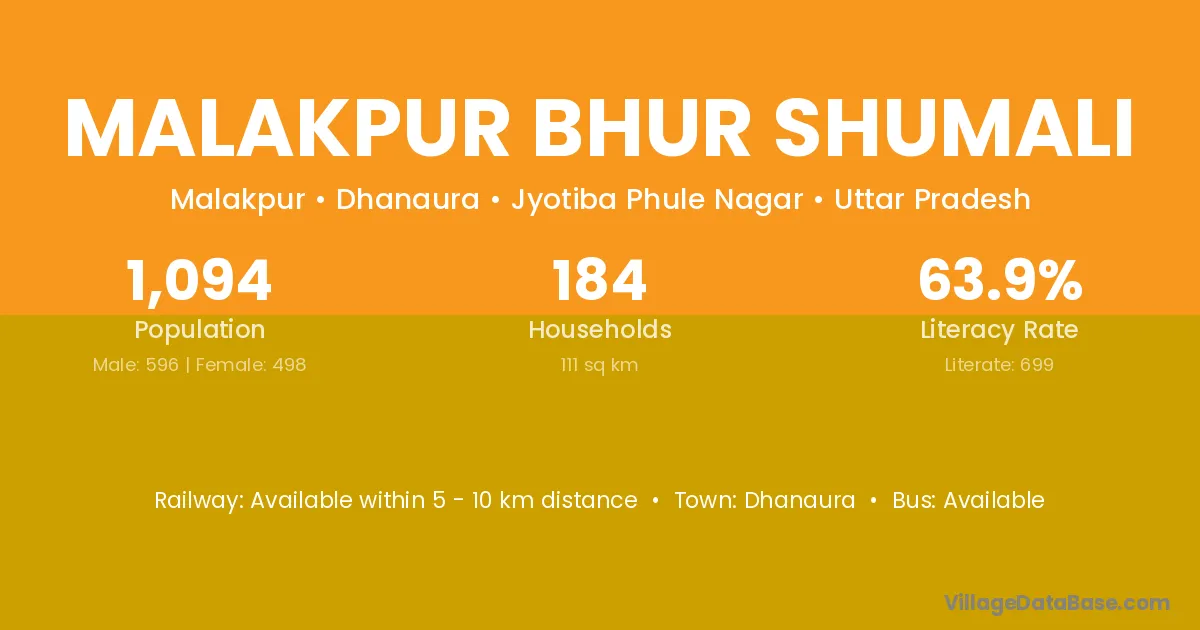 Malakpur Bhur Shumali village has a total population of 1,094 people, of which 596 are males and 498 are females.