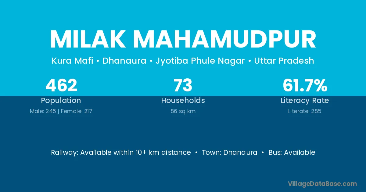 Milak Mahamudpur village has a total population of 462 people, of which 245 are males and 217 are females.