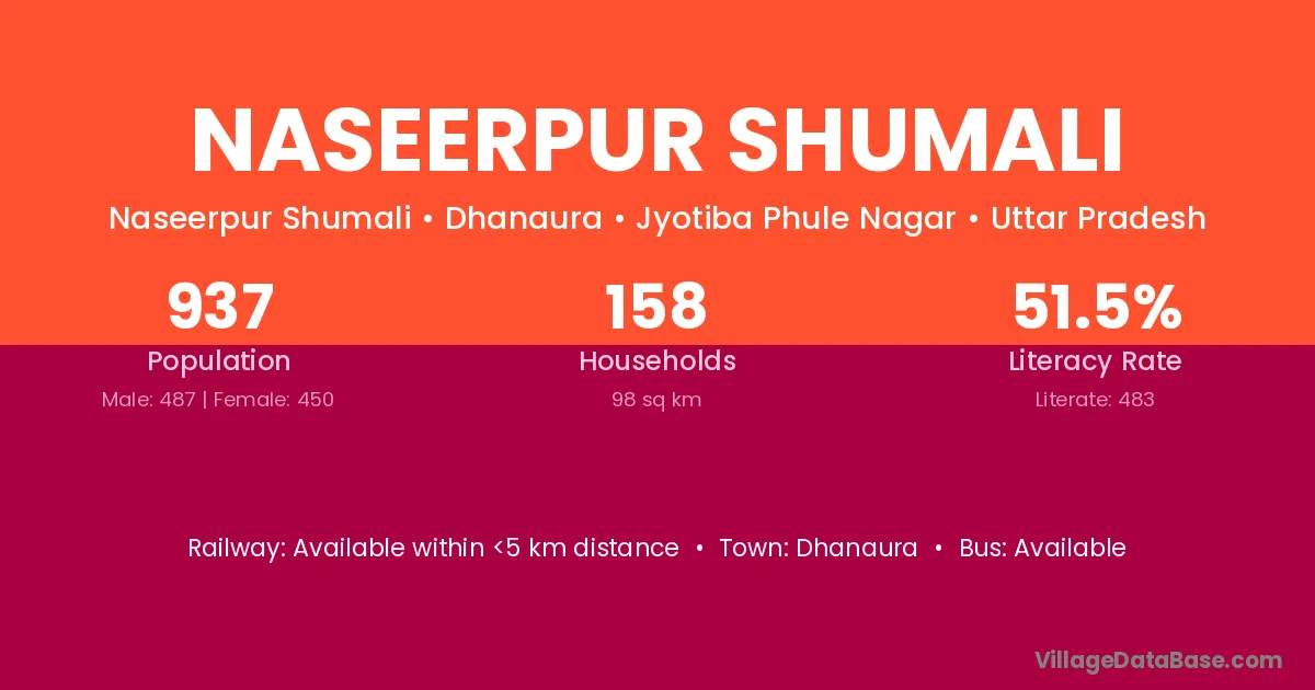 Naseerpur Shumali village has a total population of 937 people, of which 487 are males and 450 are females.