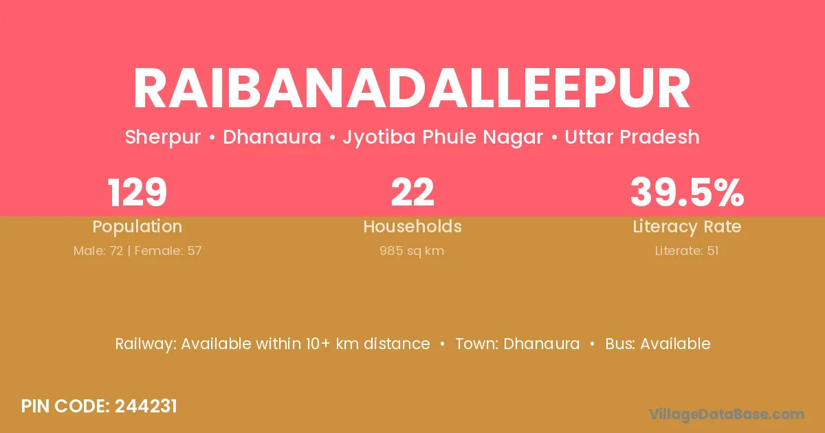 Raibanadalleepur village has a total population of 129 people, of which 72 are males and 57 are females.