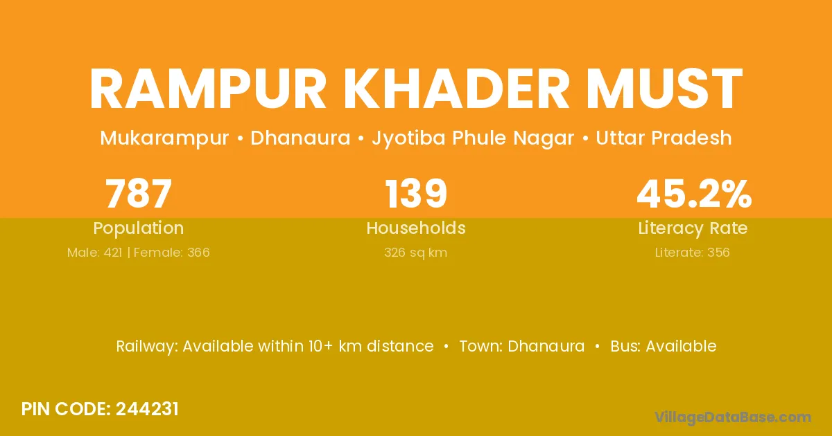 Rampur Khader Must village has a total population of 787 people, of which 421 are males and 366 are females.