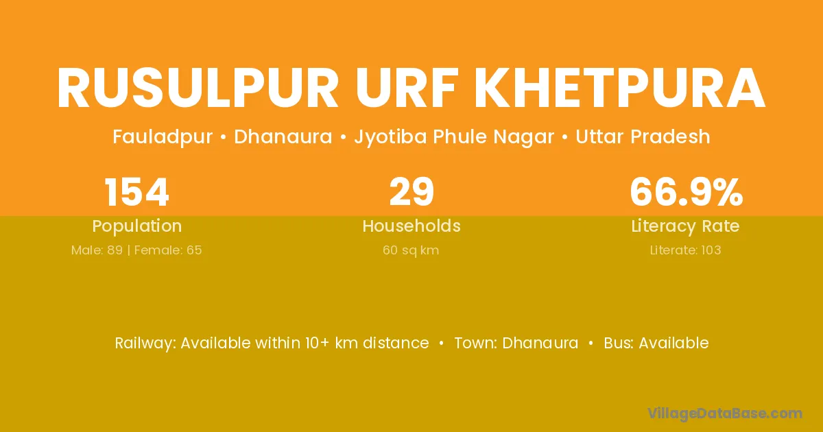 Rusulpur Urf Khetpura village has a total population of 154 people, of which 89 are males and 65 are females.