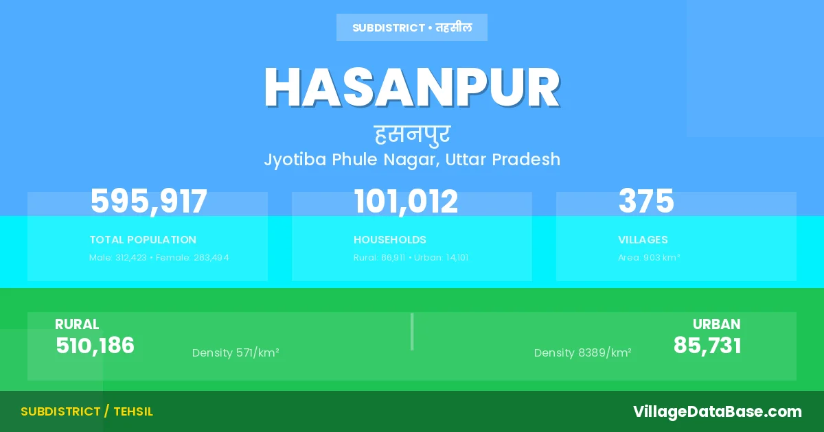 Hasanpur is a town and Tehsil in the Jyotiba Phule Nagar district of the Uttar Pradesh. In India, a Tehsil is a subdivision of a district responsible for the administration and revenue collection of a specific area within the district. Tehsils play a crucial role in the local governance structure, contributing significantly to the development and administration of their communities.