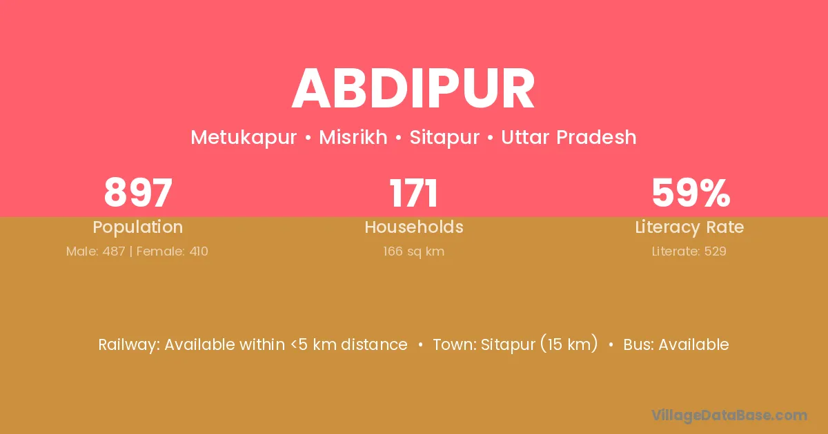 The literacy rate of Abdipur village is 54.11%. Male literacy stands at 66.13% and female literacy at 39.20%.