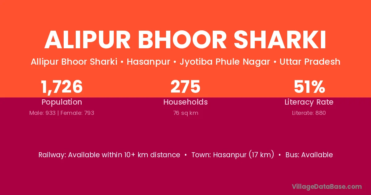 Hasanpur (17 km) is the nearest town to Alipur Bhoor Sharki village for major economic activities and is located approximately 17 km away.