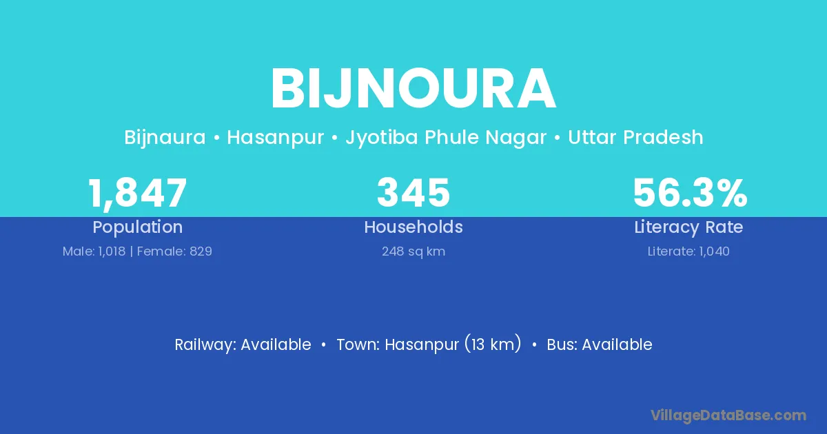 Hasanpur (13 km) is the nearest town to Bijnoura village for major economic activities and is located approximately 13 km away.