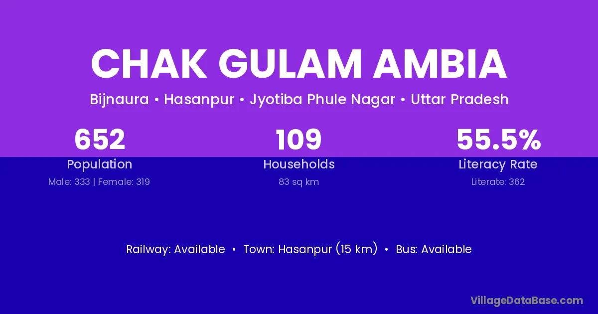 Hasanpur (15 km) is the nearest town to Chak Gulam Ambia village for major economic activities and is located approximately 15 km away.