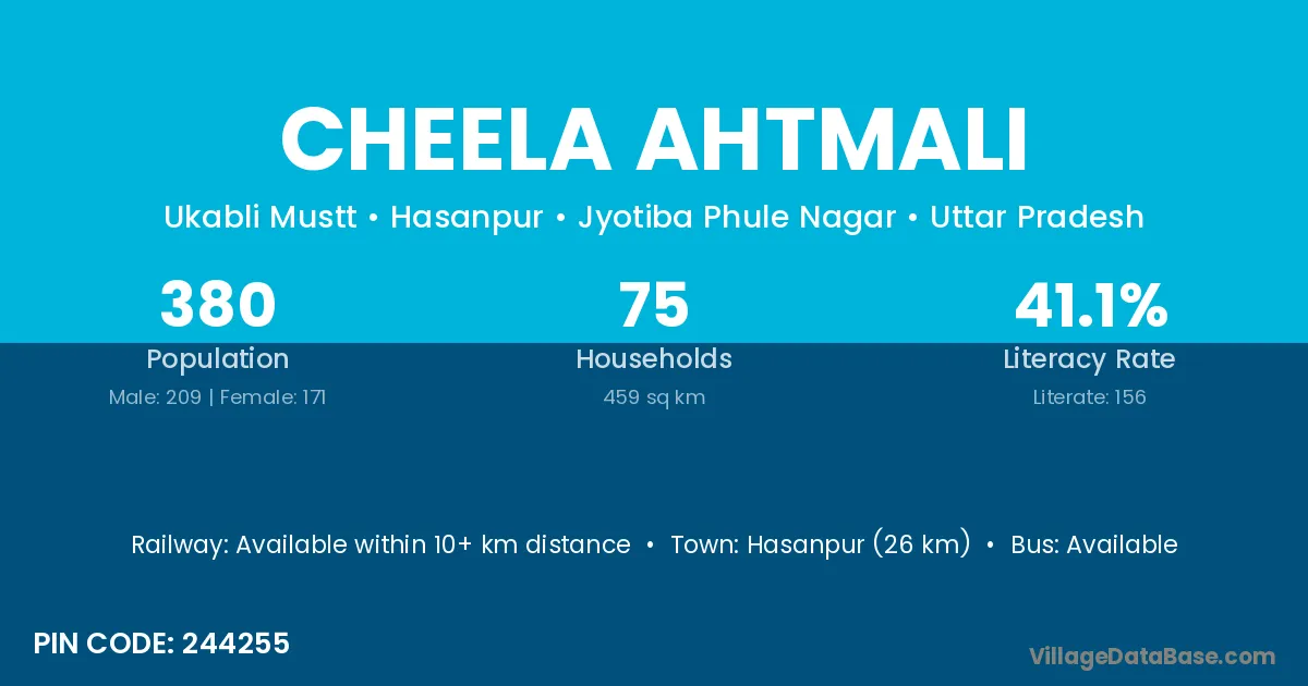 Hasanpur (26 km) is the nearest town to Cheela Ahtmali village for major economic activities and is located approximately 26 km away.