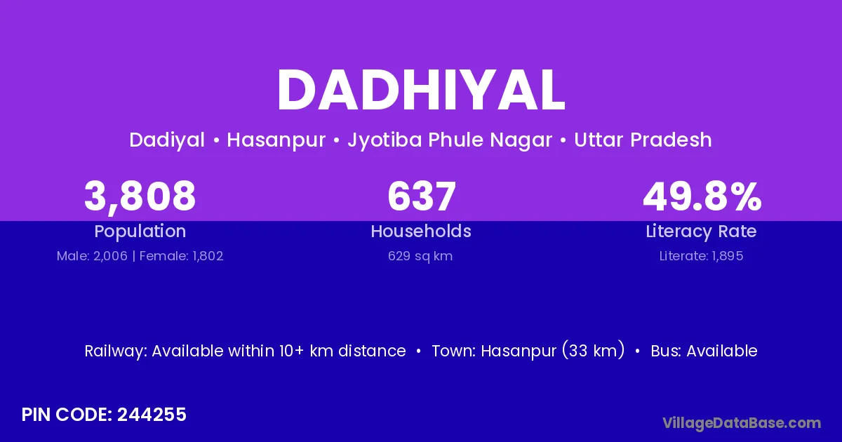 Hasanpur (33 km) is the nearest town to Dadhiyal village for major economic activities and is located approximately 33 km away.