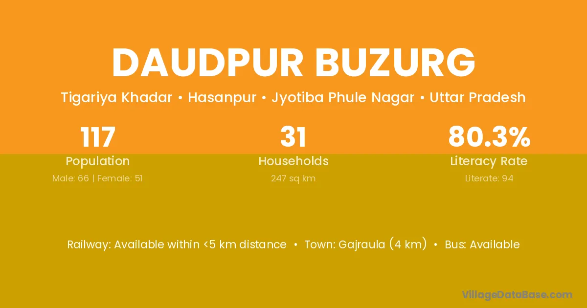 Gajraula (4 km) is the nearest town to Daudpur Buzurg village for major economic activities and is located approximately 4 km away.