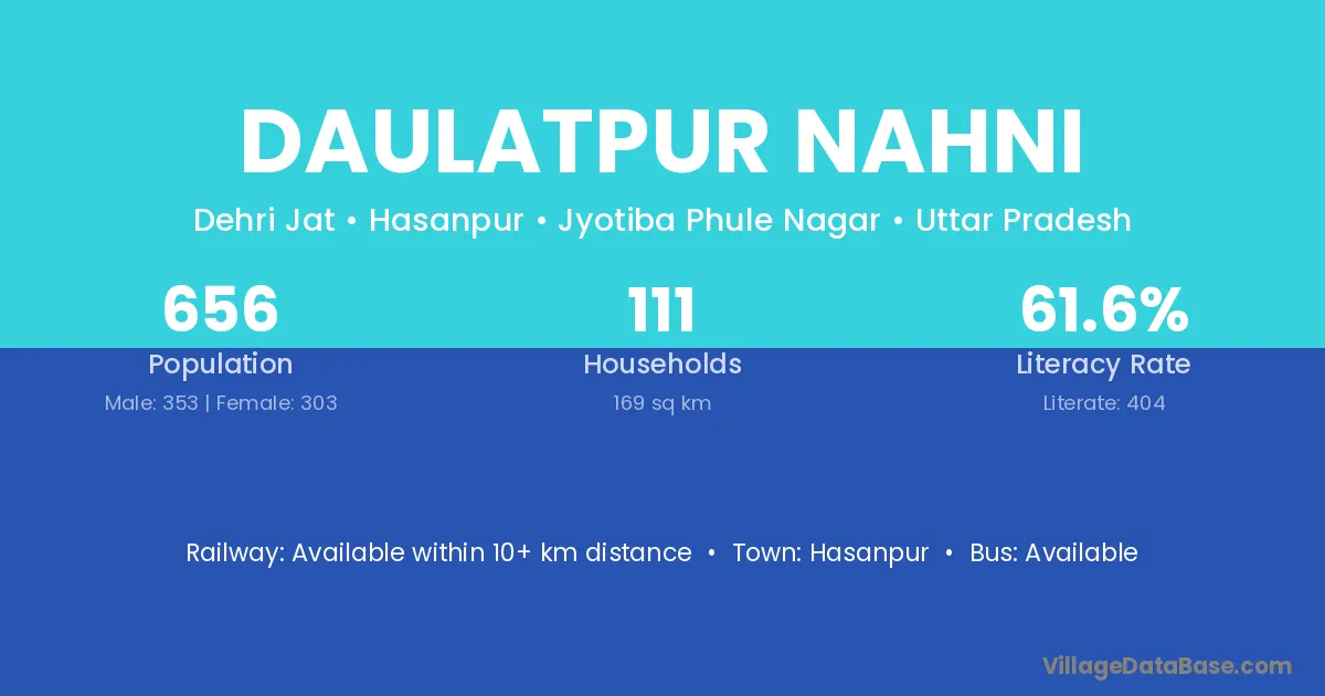 Daulatpur Nahni village has a total population of 656 people, of which 353 are males and 303 are females.