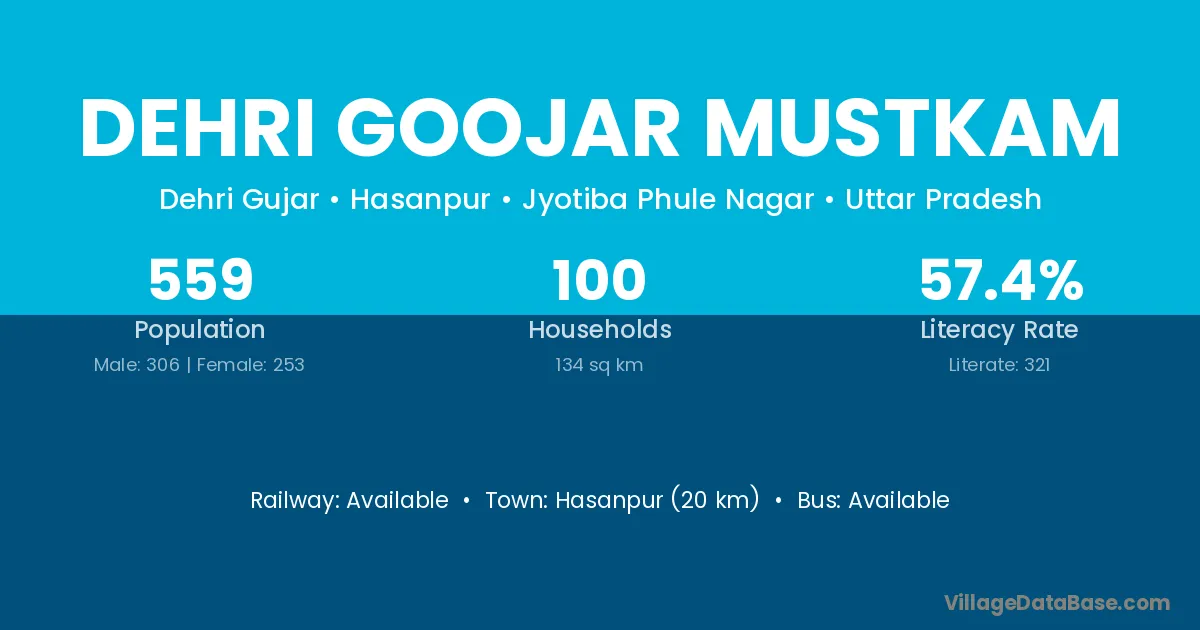 Hasanpur (20 km) is the nearest town to Dehri Goojar Mustkam village for major economic activities and is located approximately 20 km away.