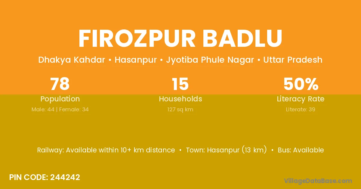 Hasanpur (13 km) is the nearest town to Firozpur Badlu village for major economic activities and is located approximately 13 km away.