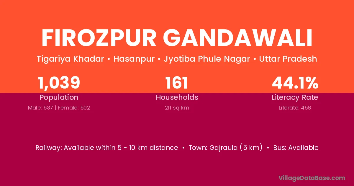 Firozpur Gandawali village has a total population of 1,039 people, of which 537 are males and 502 are females.