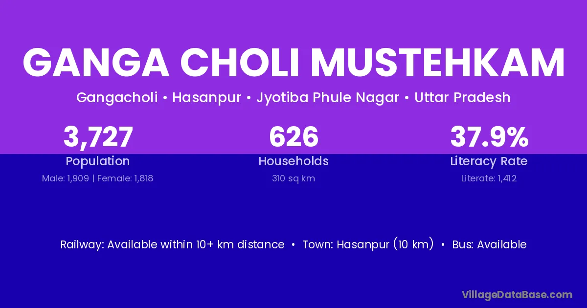 Hasanpur (10 km) is the nearest town to Ganga Choli Mustehkam village for major economic activities and is located approximately 10 km away.