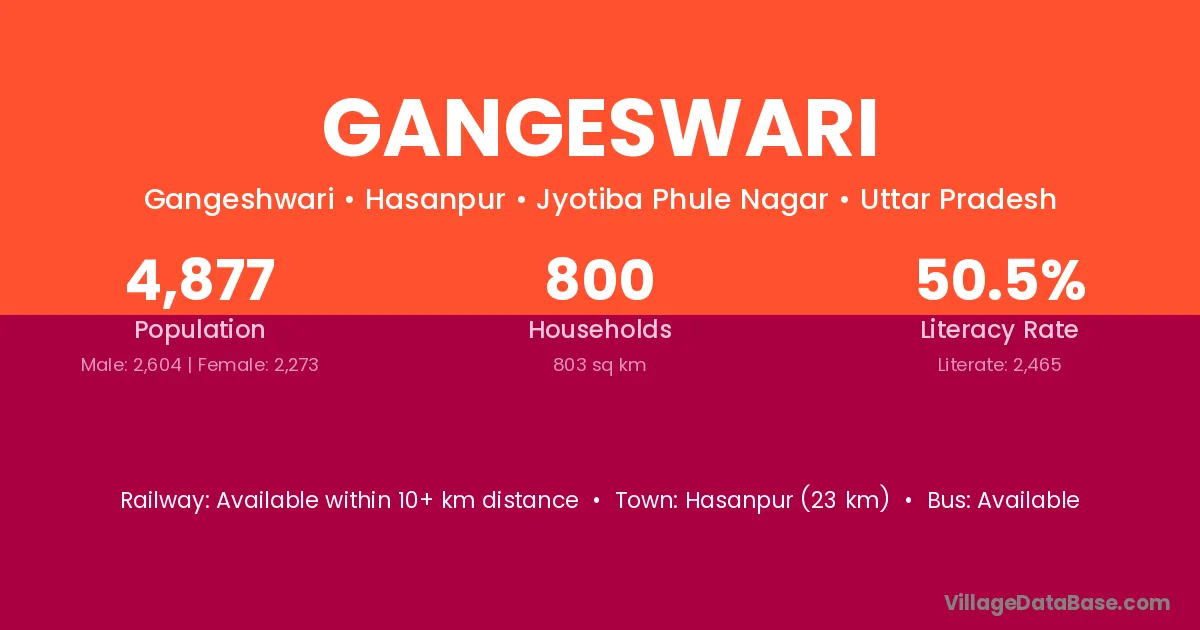 Gangeswari village has a total population of 4,877 people, of which 2,604 are males and 2,273 are females.
