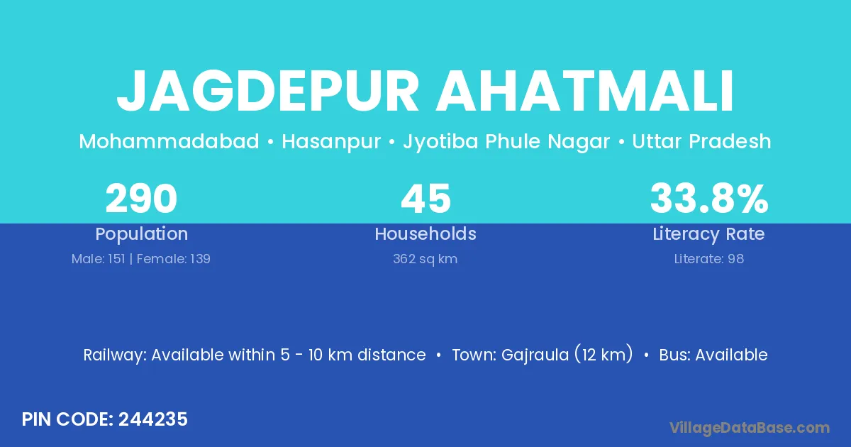 Jagdepur Ahatmali village has a total population of 290 people, of which 151 are males and 139 are females.